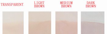 Both types of lace are available in what is described as a transparent version (but technically speaking is not actually transparent) as well las a light beige colour (similar to peach), a light brown, medium brown and dark brown.