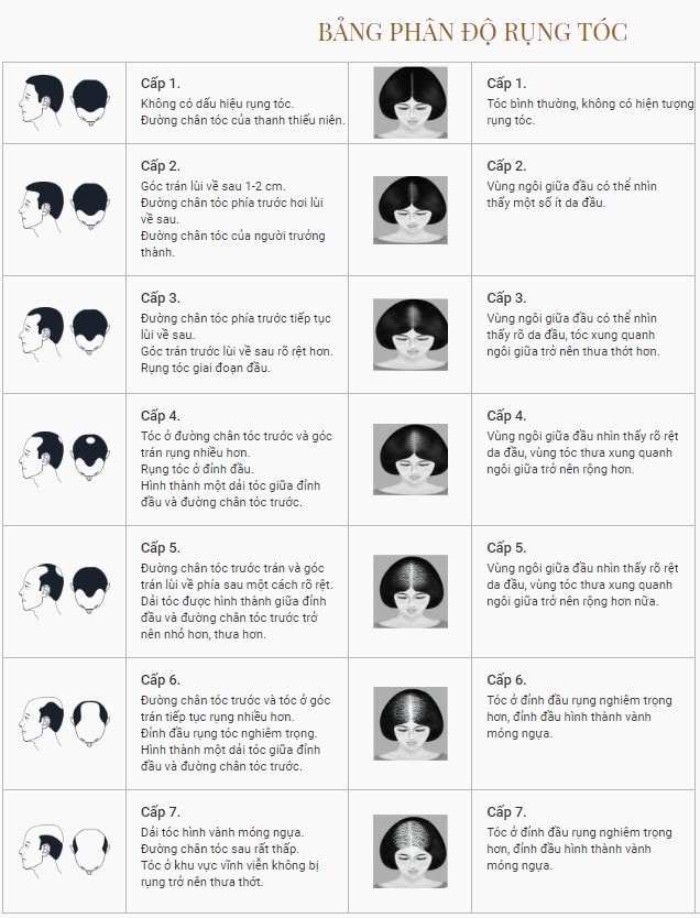 khi đã biết các nguyên nhân dẫn đến việc rụng tóc, bạn cần biết đến các cấp độ rụng tóc mà bạn đang bị để có phương án xử lý phù hợp : dưới dây là bảng phân loại cấp độ rụng tóc (bảng phân loại cấp độ hói của cả Nam và Nữ)